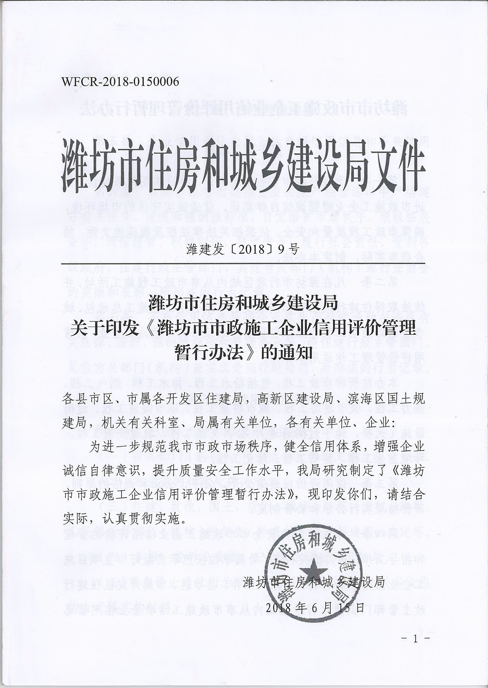 《濰坊市市政施工企業(yè)信用評價管理暫行辦法》下發(fā)